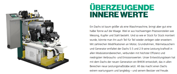 Als serienreifes und vielfach erprobtes Energiesystem ist der DACHS für Bauherren und Hausbesitzer eine Energiealternative, die höchste Ansprüche an Wirtschaftlichkeit, innovative Technik und Umweltschutz erfüllt.