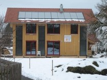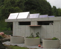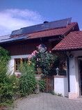 Sonnenhaus mit 13,5m² Fasadenkollektoren und 30m² Indachkollektoren, Pufferspeicher 9400 Liter Nachheizung mit Heizeinsatz im Wohnraum mit 28 kW Wasserleistung